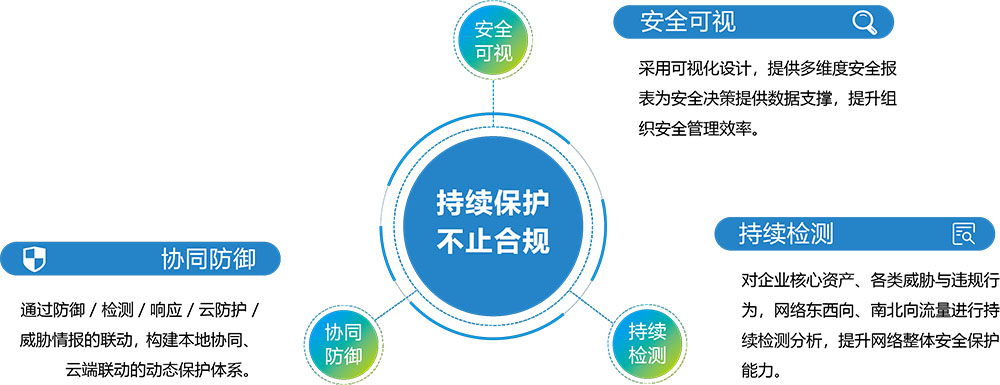为了践行前沿网络安全理念,打造网络安全生态圈,提倡“持续保护、不止合规”的等保核心价值。以可视化的方式让用户看清资产、业务关系,看懂威胁、安全风险;对网络中各类风险持续检测,将安全运营工作化繁为简;构建本地协同、云端联动的动态保护体系,让用户感受到等级保护带来的实际价值。