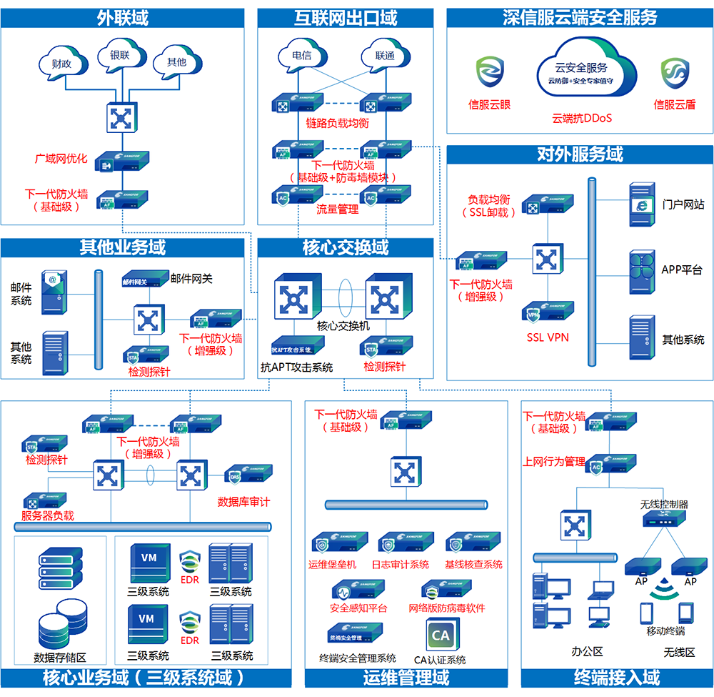 在方案设计阶段,以《网络安全等级保护基本要求》、《网络安全等级保护安全设计技术要求》等国家标准文件,并结合行业特性要求、监管单位要求、用户提出的额外安全需求进行系统性方案设计。在满足相应等级安全物理环境、安全通信网络、安全区域边界、安全计算环境、安全管理中心及管理部分要求基础上,较大程度发挥安全措施的保护能力。