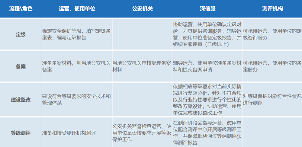 网络安全等级保护工作包括定级、备案、建设整改、等级测评、监督检查五个阶段。在等级保护全流程中,涉及到四个不同的角色,分别是:运营使用单位、公安机关、安全厂家、测评机构。等级保护各工作流程内容及角色分工如下: