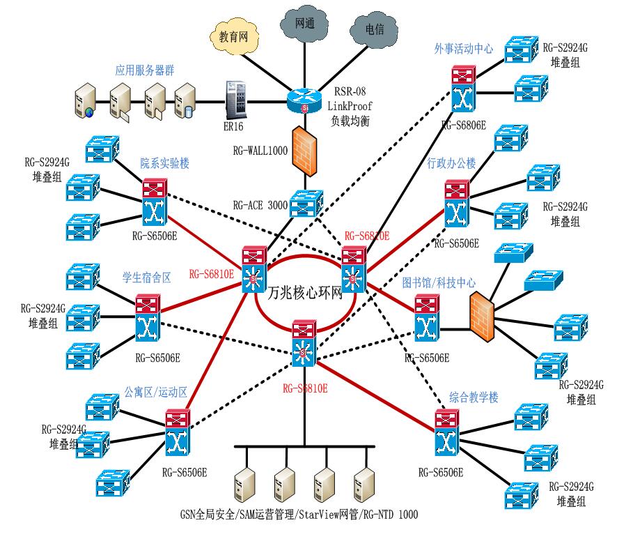 在此方案中,校区网络中心采用RG-S6810E多业务万兆核心路由交换机作为核心交换机。核心层交换机跟汇聚接入层交换机之间的千兆链路可以捆绑,从而实现带宽的灵活扩展。