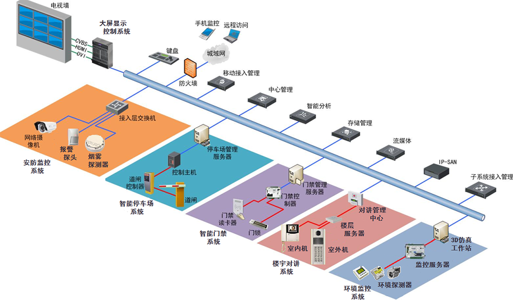 智能楼宇系统解决方案提供了包括安防监控系统、智能停车场系统、智能门禁系统、楼宇对讲系统、大屏显示控制系统、环境监控系统等在内的完整的智能楼宇解决方案,并提供了一套综合软件管理平台对各个模块进行集中管理。通过对监控智能分析、人脸识别、车牌识别、可视对讲等技术的应用,可实现对人员出入信息、停车场车辆出入信息、楼宇环境信息、人员行为信息的智能采集、安全监控及快速告警。