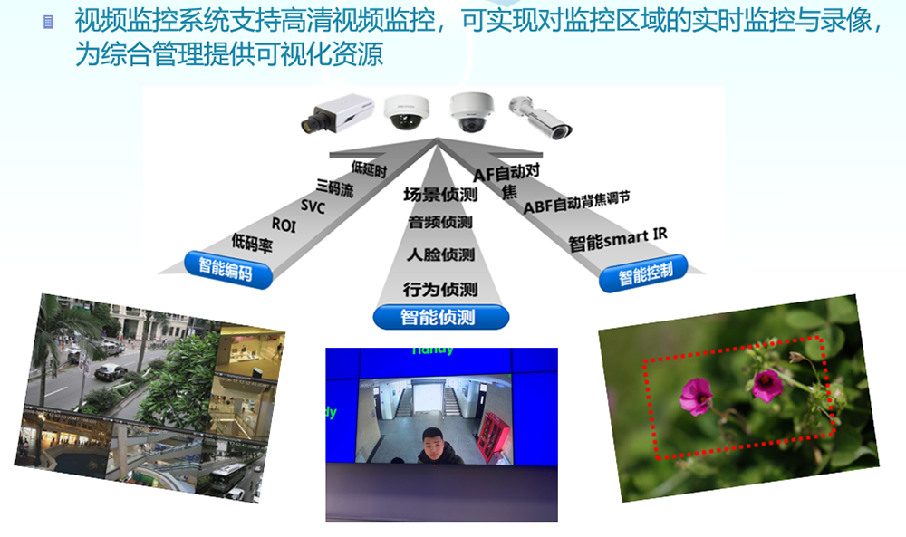 (1)视频监控系统支持高清视频监控,可实现对监控区域的实时监控与录像,为综合管理提供可视化资源
